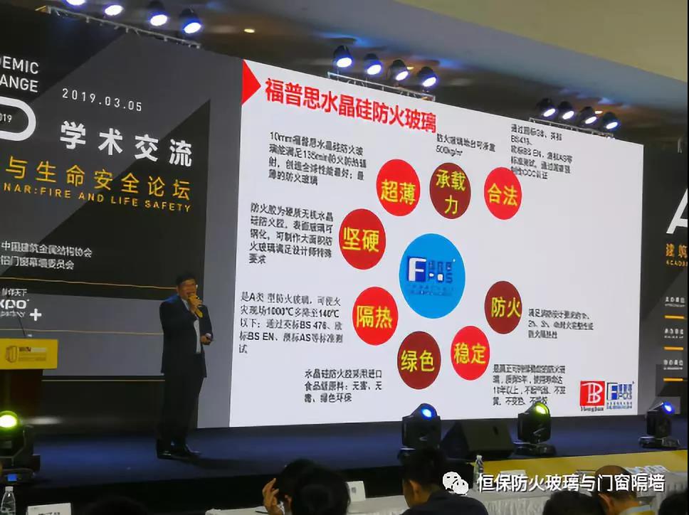 在這次展會中,恒保公司榮獲兩大獎項,獲各界客商對恒保的肯定和實力的彰顯。在第25屆鋁門窗幕墻新產品博覽會歡迎晚宴暨第5屆中國門窗幕墻創新星品獎頒獎典禮中,鶴山恒保榮獲2019年度“創新新品獎”。3月5日上午,陳沃林總經理并在星品匯現場演講《CCC認證超大甲級防火窗(地鐵高鐵控制室觀察窗)》。恒保GFC3020超大甲級防火窗,具有非常好的防火隔熱性能,完全滿足甲級防火窗的要求,且10年以上不發黃、不發白穩定可靠。認證尺寸寬3000mm高2000mm,是目前中國已獲國家檢驗報告和CCC強制性認證的單塊玻璃尺寸最大的防火窗;整窗都滿足防火完整性和隔熱性1.5小時的要求,既符合建筑設計防火規范條例,又滿足窗的通透性,美觀實用。完美解決了地鐵高鐵消防控制室超大甲級防火觀察窗合法化的問題,是地鐵高鐵等重要場所設備用房的防火觀察窗必選產品。