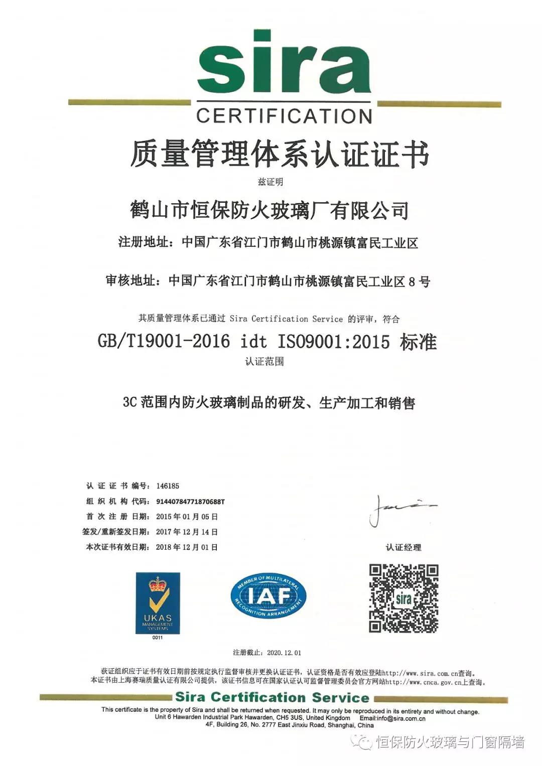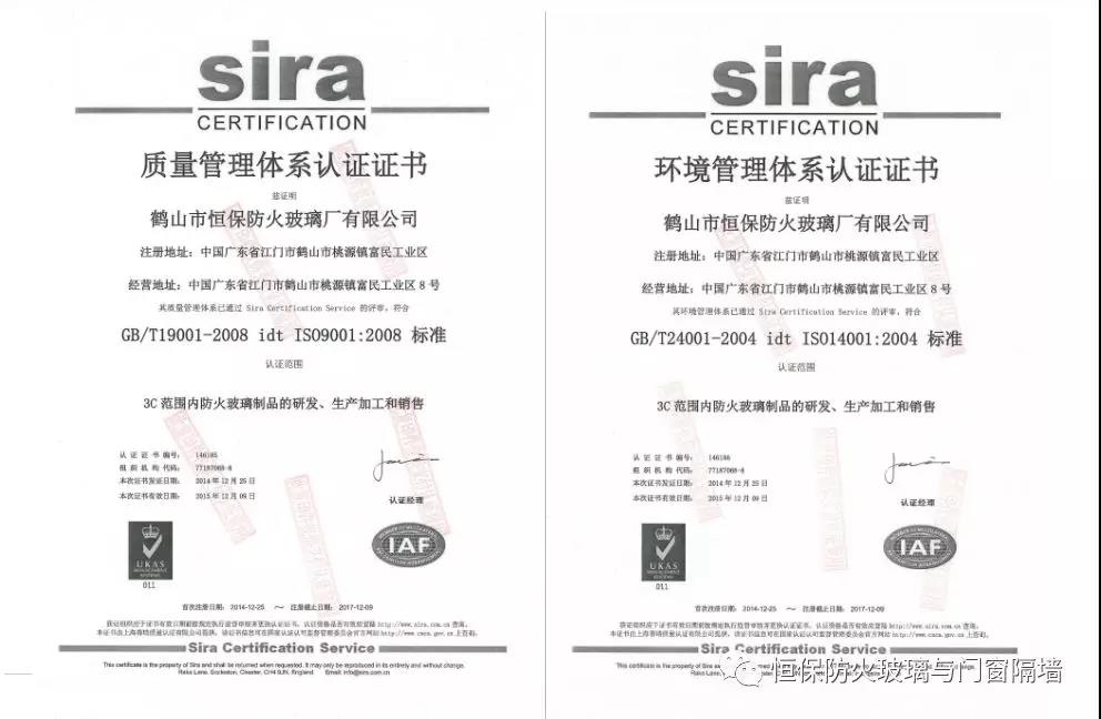 鶴山市恒保防火玻璃廠有限公司,自2014年第一次獲得ISO9001-2008質量管理體系、ISO14001-2008環(huán)境管理體系認證。并與原企業(yè)管理體系相結合,與CCC強制性認證產(chǎn)品企業(yè)管理體系相融合,建立了更完善的科研、開發(fā)、生產(chǎn)、銷售和售后服務體系,使恒保公司穩(wěn)健快速增長。