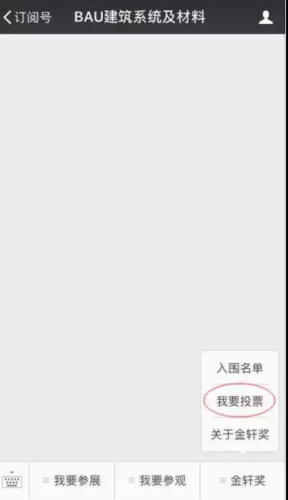 進入微信,找到“BAU建筑系統及材料”點擊右下方“金軒獎-我要投票”欄目進入投票頁面進行投票。