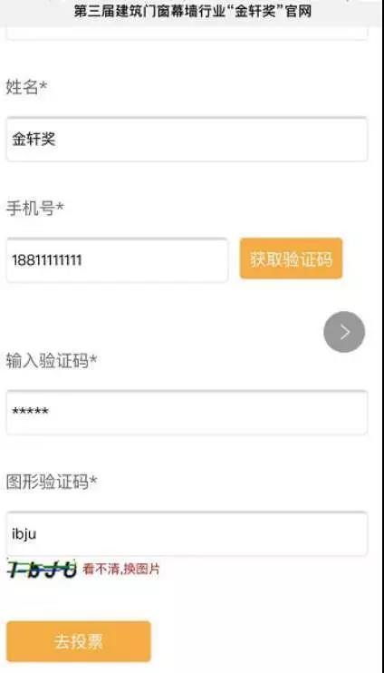 進入投票頁面,彈出實名制個人信息填寫表格——請填寫完整個人信息,點擊獲取驗證碼并輸入后提交。