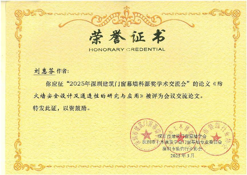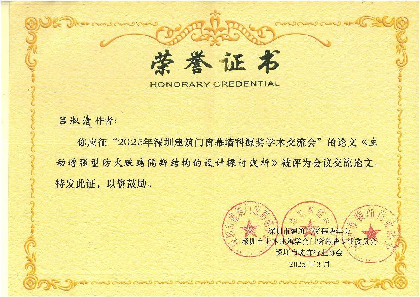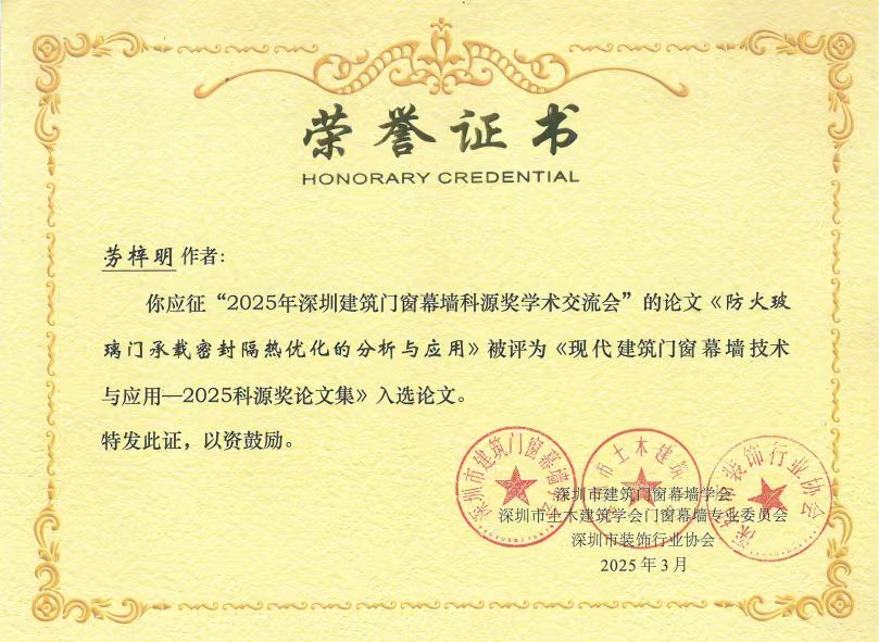 在2025科源獎獲獎學術論文及學術交流先進單位頒獎儀式中,恒保公司共3篇論文榮獲學會表彰,其中工程師勞梓明撰寫的《防火玻璃門承載密封隔熱優化的分析和應用》被評為《現代建筑門窗幕墻技術與應用——2025科源獎論文集》入選論文!